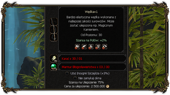 Wędki ulepszamy standardowo: Zwojami Błogosławieństwa oraz Magicznymi Kamieniami.